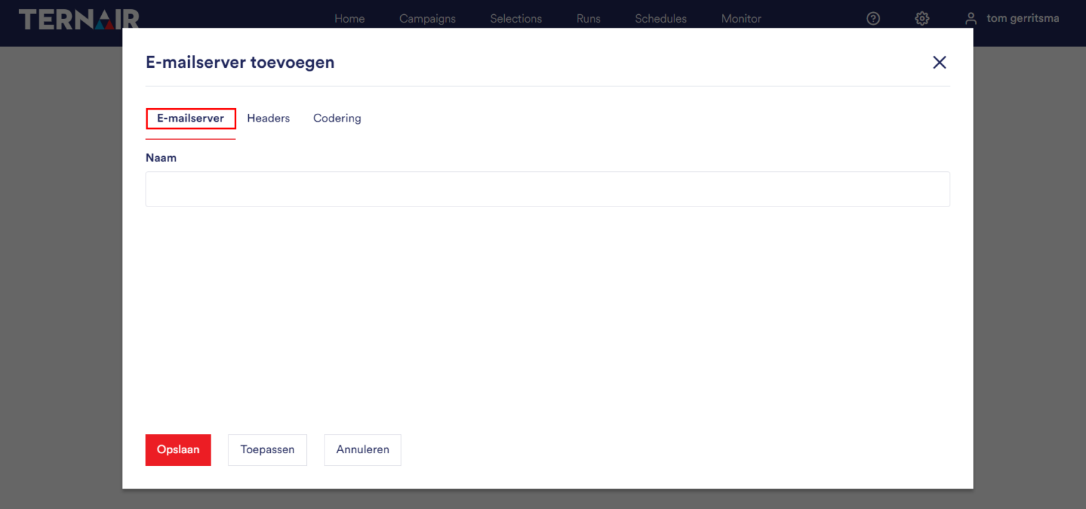 Click the 'Add email server' button to add a new server. Servers that have been previously added are visible on this tab. The server can be modified and deleted by clicking on the gear icon.