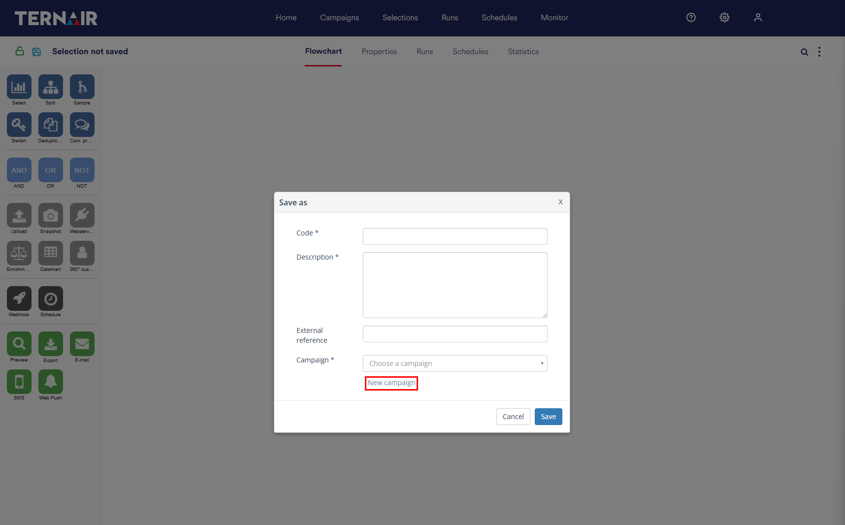 A new selection flowchart can be assigned to either a new or an existing campaign. In the latter case, select 'new campaign' when saving the new selection flowchart.