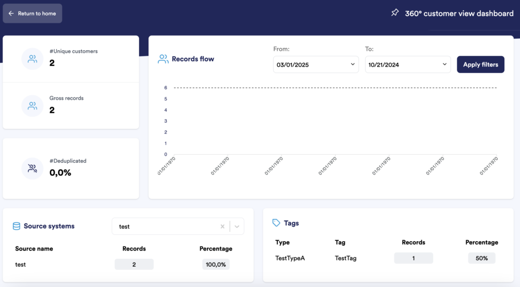 If you have activated the 360° customer view module in Ternair, you will see the filling of the 360° customer view here. In this module you can load different data sources. These include customers and characteristics (Tags). The dashboard shows the total number of customers, the sources that have been read including the corresponding deduplication. Finally, it lists the most common attributes and the percentage of customers that have such an attribute.