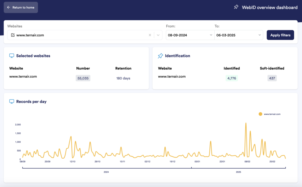 If you have activated the web recognition module in Ternair, here you can see the total number of websites and total number of sessions where web recognition is active.