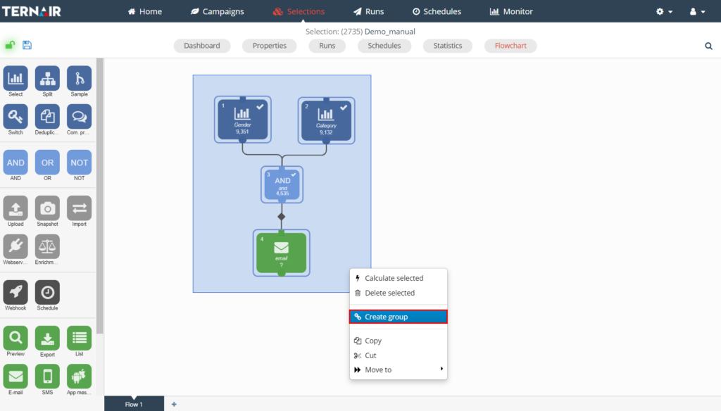 The icons in the group indicate the type of block(s) included in the group and the number of blocks per type. In the example above, the group contains a selection block, a connection block and an e-mail block.