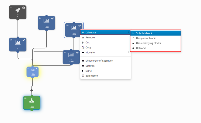 When recalculating blocks, you can choose whether to refresh all blocks or part of them. This can save time when making small or partial changes to selections.