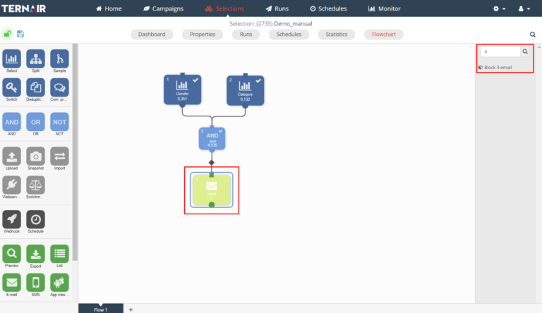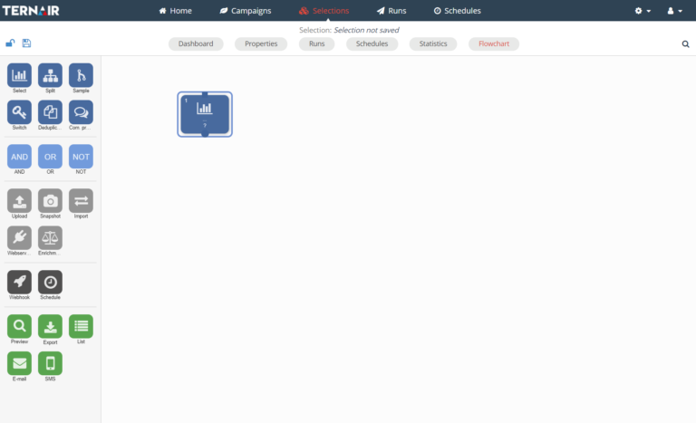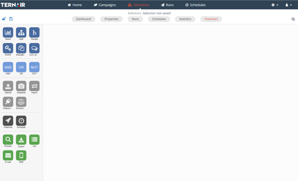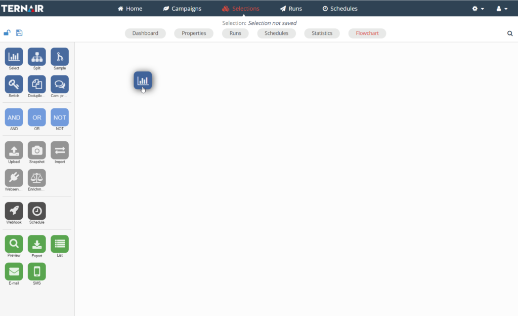 On the left side of the window, depending on Ternair's settings, different functions (blocks) are displayed. You can use these blocks by left-clicking on a block and dragging it to the (still empty) white part of the selection worksheet.
