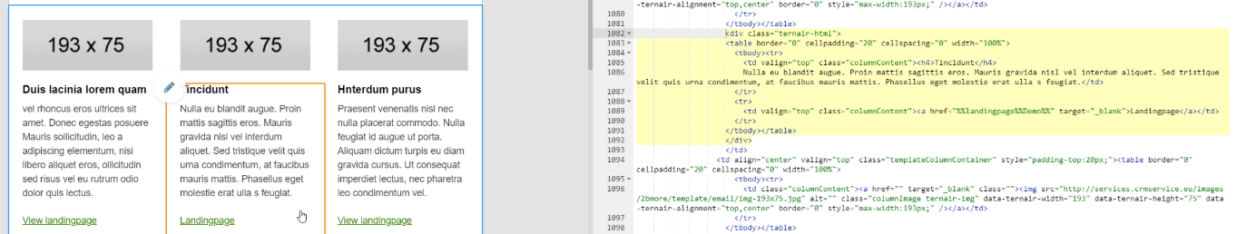 When editing an e-mail, the selected part on the left side of the screen is highlighted in the HTML editor on the right of the screen (yellow highlight).