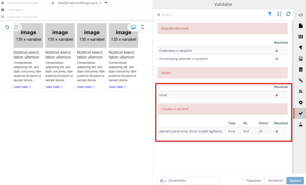A red (out)line of the HTML drop zone is shown when HTML is invalid.