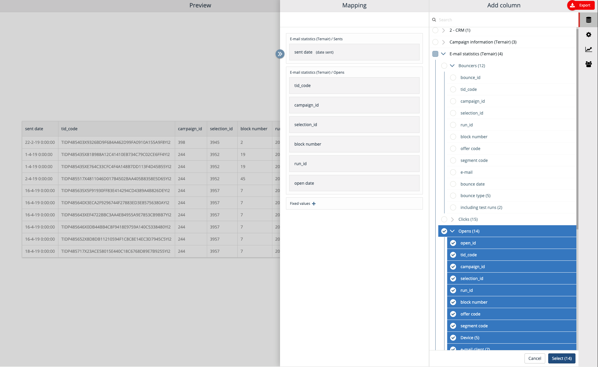 The position of the Select and Cancel buttons in the data mapping view are fixed and always visible when adding columns via the data mapping.