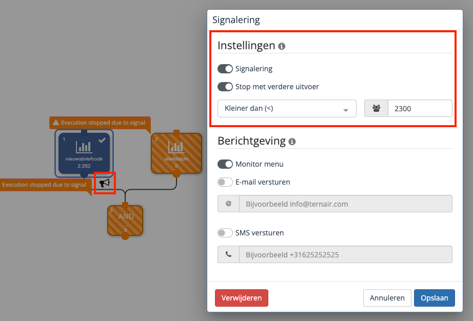 You can now also stop the output of selection blocks, if they reach a certain number. As soon as the output of the block falls outside the specified value, you will receive immediate notification via a notification in Campaign, an email or text message and further output will be stopped. The corresponding block turns orange.