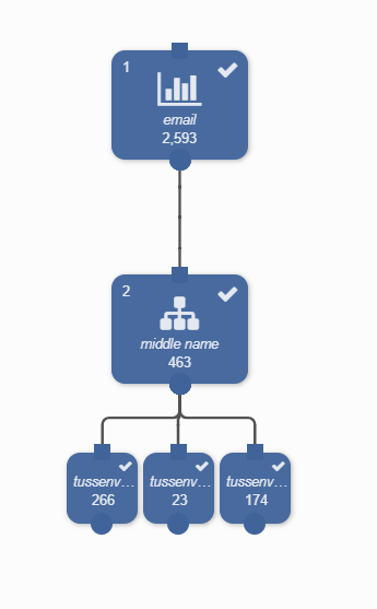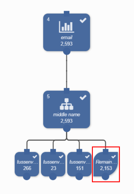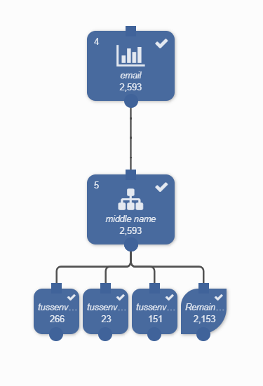 Het split blok wordt gesplitst in vier segment blokken. Het totaal van de split blokken is gelijk aan het totaal aantal records in het input blok. De 2.593 records worden nu uitgesplitst in 266 records waarvan tussenvoegsel ‘van’ is, 23 records waarvan tussenvoegsel ‘van de’ is, 151 records waarvan tussenvoegsel ‘van de’ bevat (maar niet gelijk is aan ‘van de’) en 2.153 records die aan geen van de drie gespecificeerde definities voldoen.