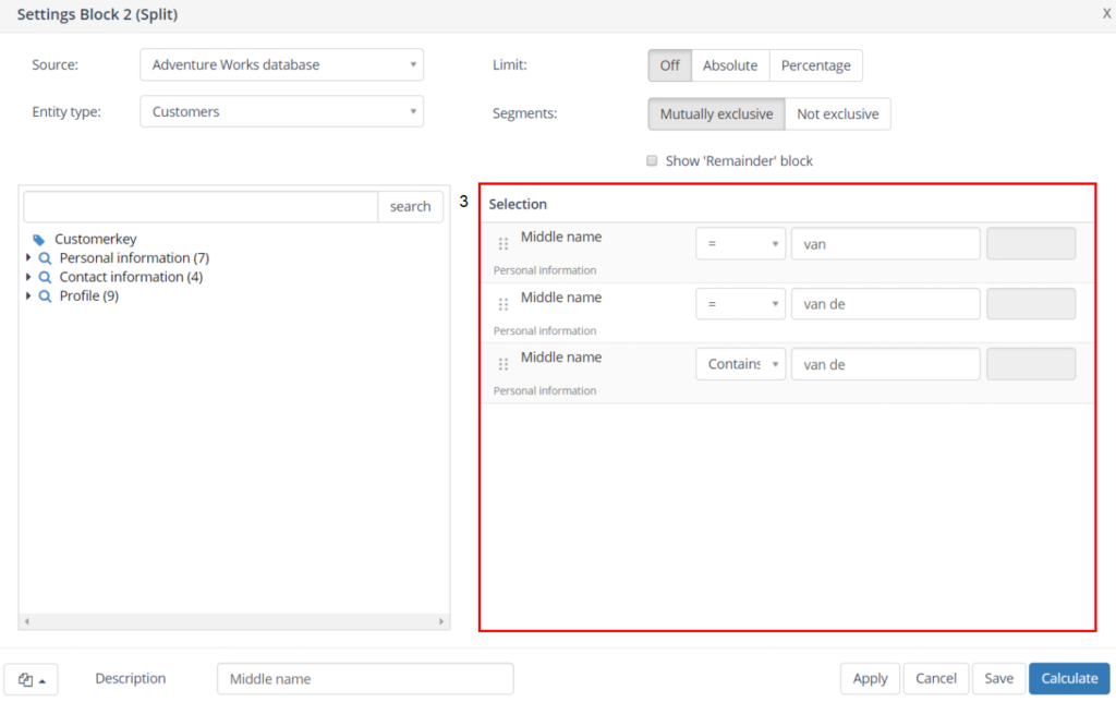 In bovenstaand voorbeeld is de selectie gesplitst op basis van tussenvoegsel en zijn de records in drie groepen gesplitst.