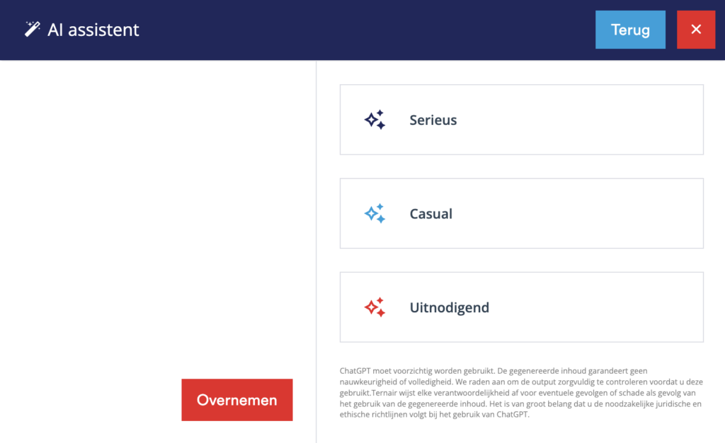 Wanneer je tevreden bent over de tekst, klik je op de button ‘Overnemen’. De tekst wordt dan overgenomen in de e-mail.