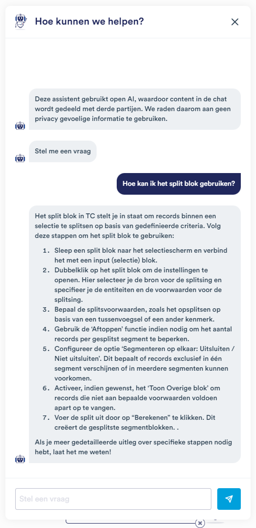 Het is belangrijk op te merken dat onze chatbot ontwikkeld is met jouw privacy en veiligheid in gedachten. Daarom delen we geen persoonsgegevens met de chatbot. De chatbot maakt alleen gebruik van OpenAI’s technologie om informatie op te halen uit de handleiding.