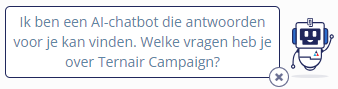 Ternair Campaign heeft een Chatbot die gebruikt maakt van Open AI. De chatbot staat klaar om je te assisteren bij het creëren van je campagnes door op aanvraag specifieke hulp vanuit de handleiding te tonen.