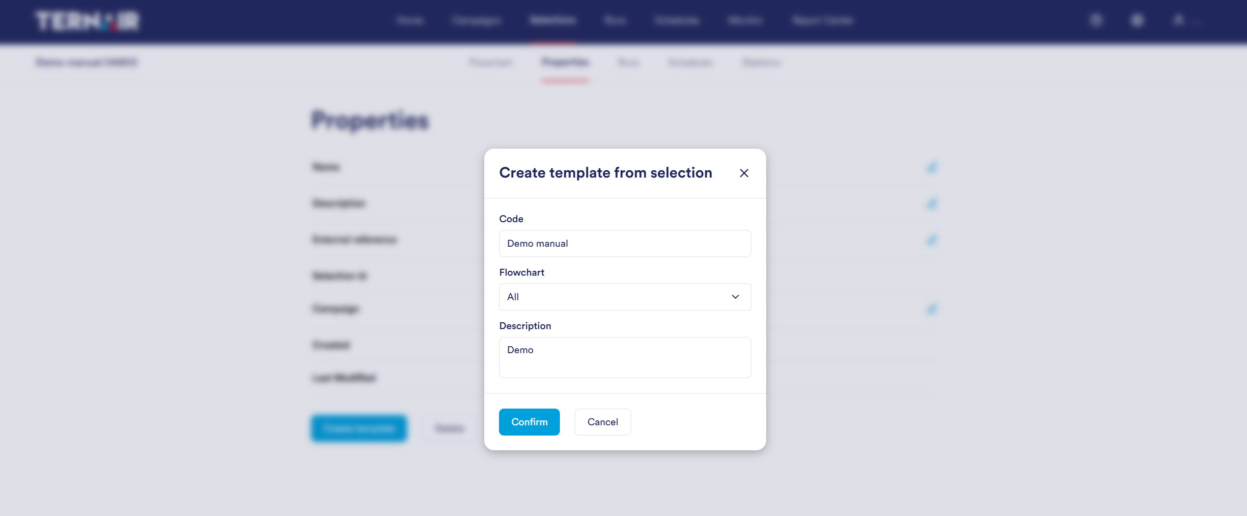 Open een selectie-flowchart en klik in het eigenschappen-scherm op de blauwe button 'Template aanmaken'.
