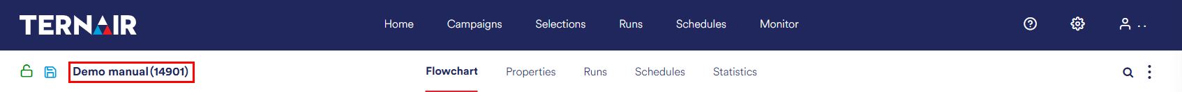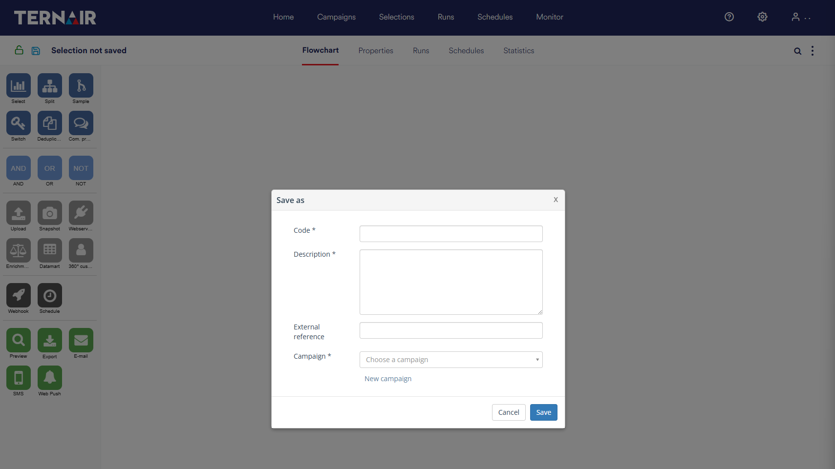 Voer een code (naam) en omschrijving in voor de selectie flowchart en wijs de flowchart aan een nieuwe of bestaande campagne toe. Deze velden moeten verplicht worden ingevuld.