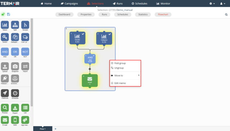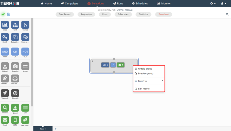 Om de selectie flowchart overzichtelijk te houden is het mogelijk om meerdere blokken in een groep te plaatsen. De groep kan dan worden ingeklapt zodat er meer vrije ruimte op het werkblad beschikbaar is.