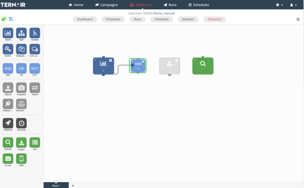 Blok 1 en 2 hebben zowel een input als een output, blok 3 heeft alleen een output en blok 4 heeft alleen een input. De blokken kunnen aan elkaar worden verbonden door output (cirkel) te selecteren en vervolgens, terwijl je de linkermuisknop ingedrukt houdt, de lijn die op het scherm verschijnt naar een blok met een input (vierkant) te slepen. Wanneer een groen vierkantje verschijnt rond het blok waarnaar je de lijn hebt gesleept, kun je de linkermuisknop loslaten.