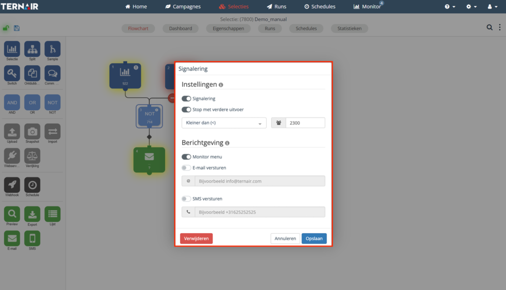 Je kunt voor selectieblokken een signaleringswaarde instellen. Zodra de output van het blok buiten de opgegeven waarde valt, ontvang je direct bericht via een melding in Campaign, een e-mail of sms.